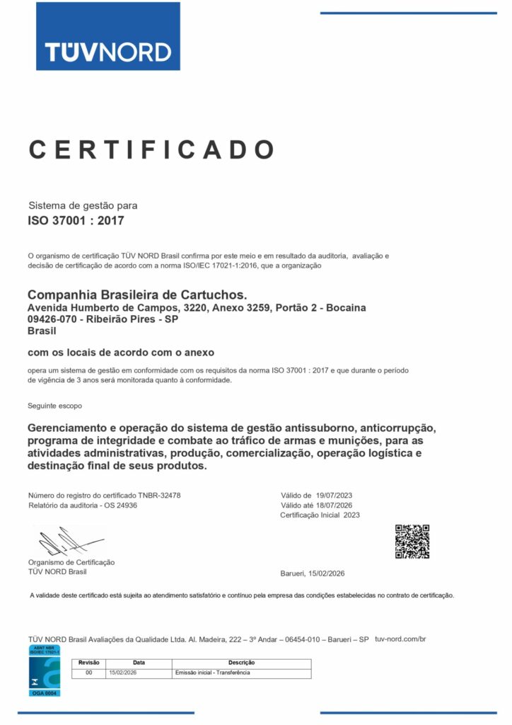 Em julho de 2023, a CBC obteve a certificação ISO 37001, o que formaliza e garante nosso compromisso com as melhores práticas anticorrupção, antissuborno e de combate ao tráfico de armas e munições, de acordo com nosso escopo definido.